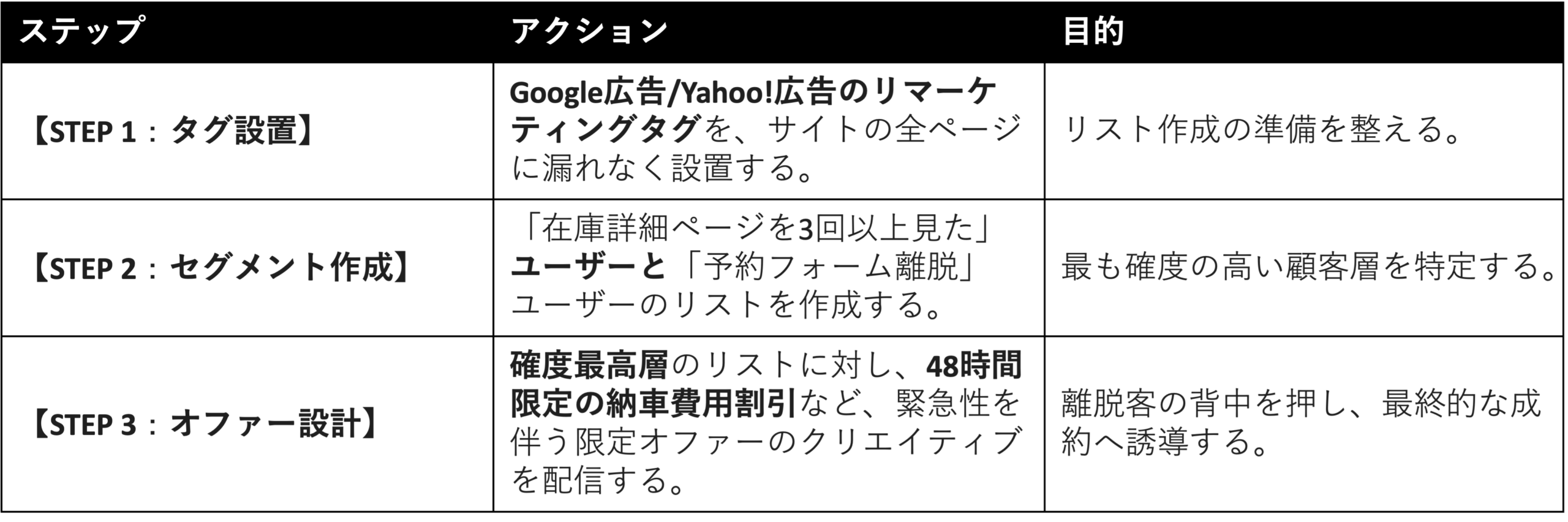 ・クリエイティブ訴求: 「【在庫No.〇〇】〇〇(車種名)がまだあります!48時間限定特典で予約」「入力途中でストップしていませんか?納車費用〇〇円割引は本日まで!」