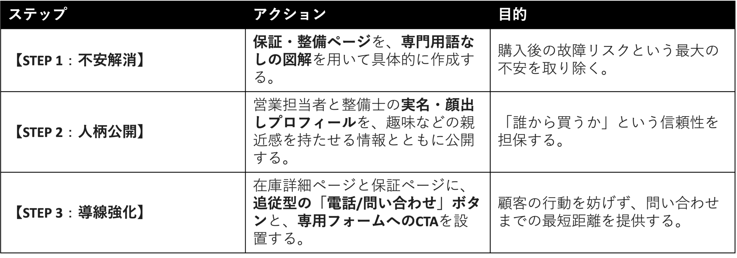 ・総額の統一: ポータルサイト、自社サイト、店頭価格の全てで、乗り出し総額を明確に表示します。
