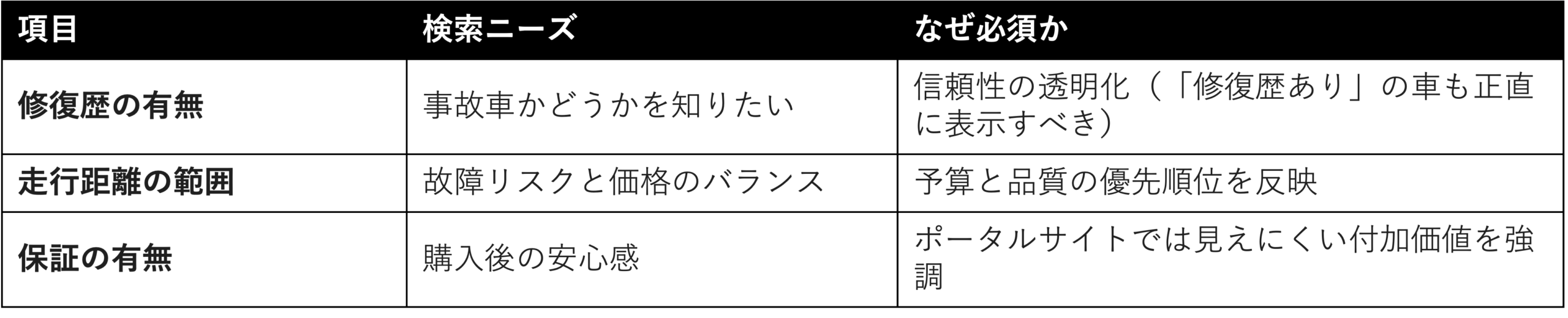 中古車特有の検索ニーズ:「車種・価格」だけでなく「走行距離・修復歴」を必須検索項目にする