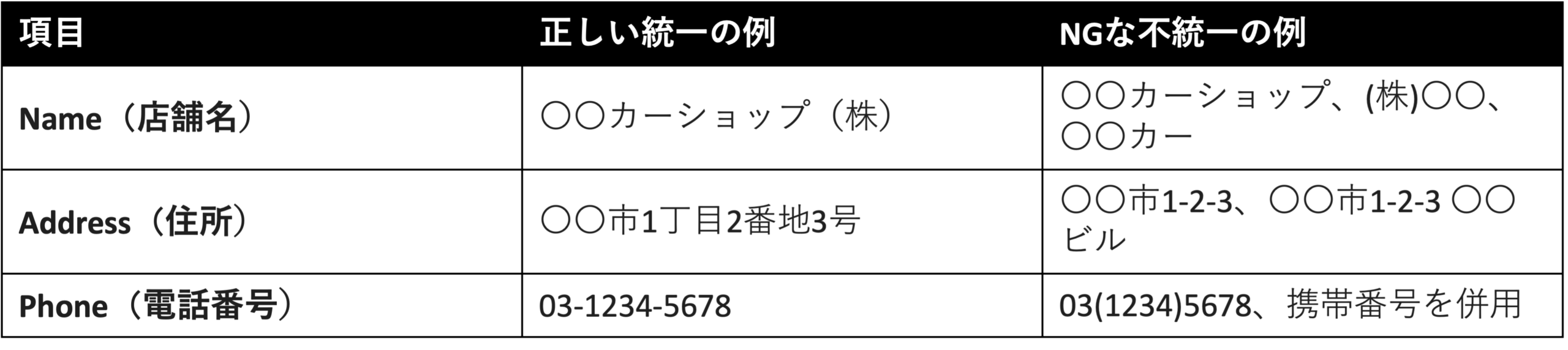 店舗名、住所、電話番号の表記を、オンライン上の全ての媒体で完全に統一します。