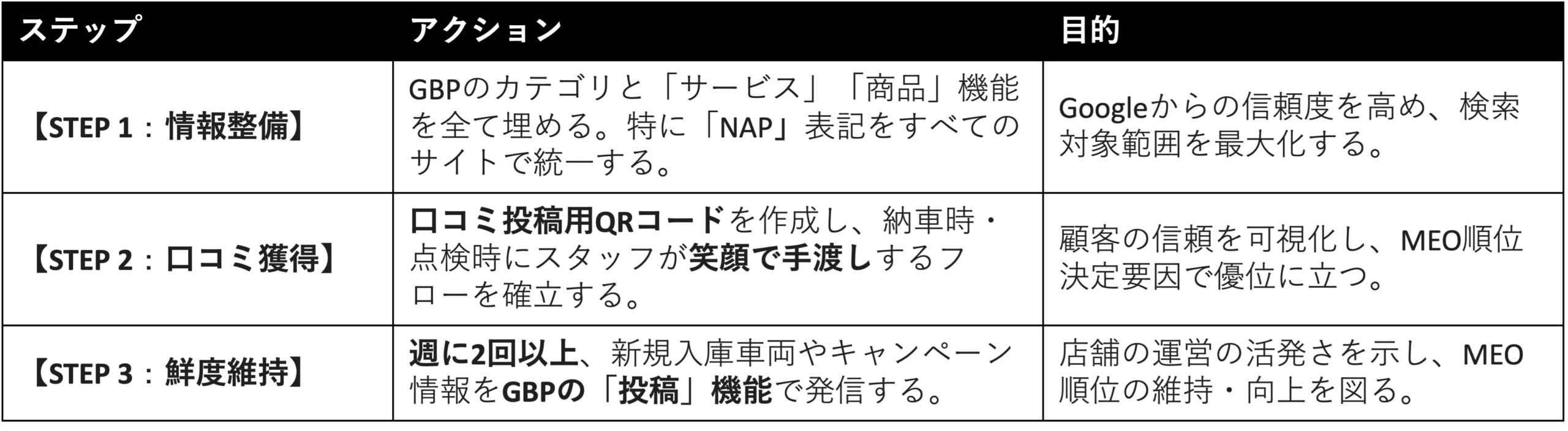 徹底すべき媒体: 公式サイト、GBP、カーセンサー/グーネットなどのポータルサイト、地域のビジネスディレクトリ、他のSNS(Facebookなど)。