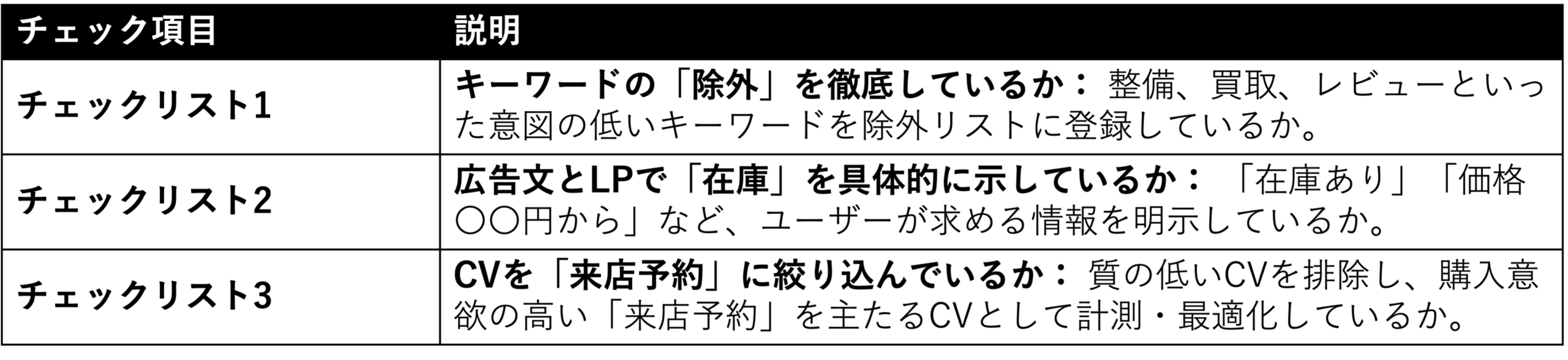 最も重要なのは、中古車特有の除外キーワードリストを整備することです。これだけでCPAは大きく改善します。